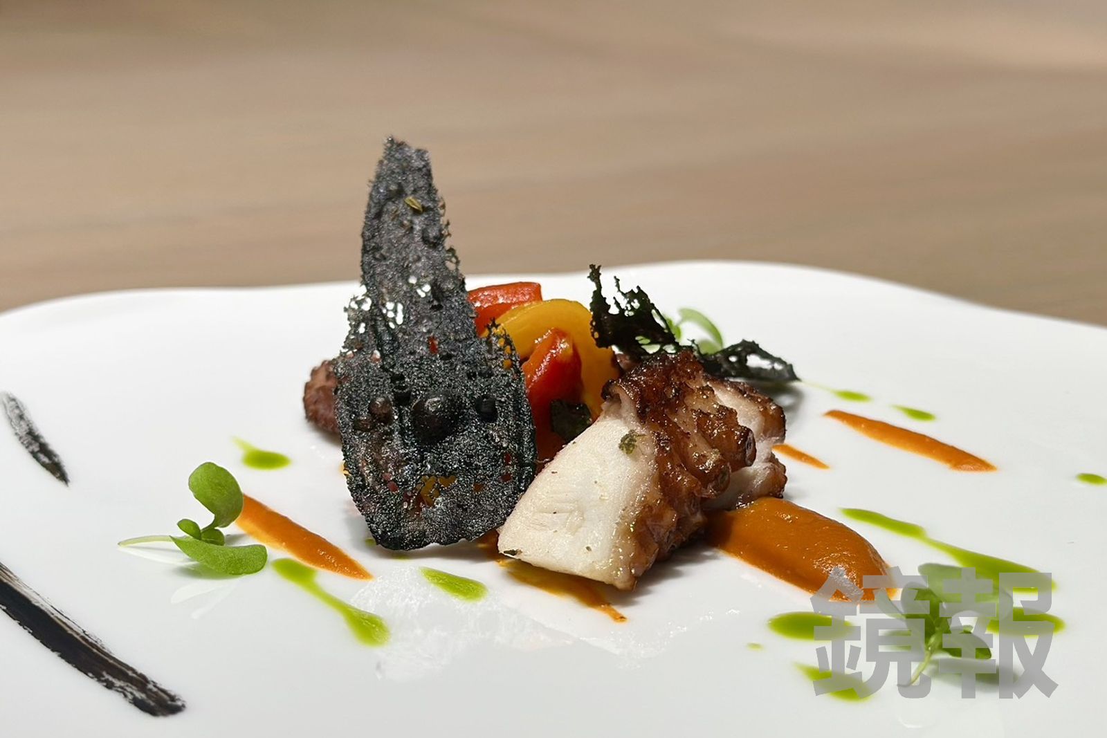 另一道「初心」,則取材自他料理生涯的第一道創作:章魚佐甜椒。他把澎湖章魚,放進以蔬菜、香料滾煮的高湯約4小時,用燜泡的方式熟透再香煎。呈現非一般Q彈的口感,而是相當軟嫩,甚至有點像魚肉般柔軟,搭配墨魚汁脆片一起吃,有自然不造作的海鹹味,可說是整套餐點的高潮。