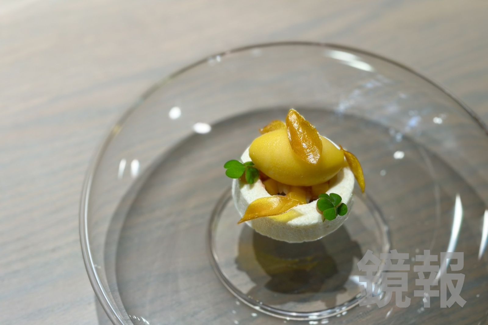 壓軸主甜點「晴」,則將盛夏芒果與甘酒慕斯、葡萄柚組合,內藏炸過的脆口野米與淡雅花香,彷彿艷陽午後的一場雨,刷洗了味蕾,帶來清爽。