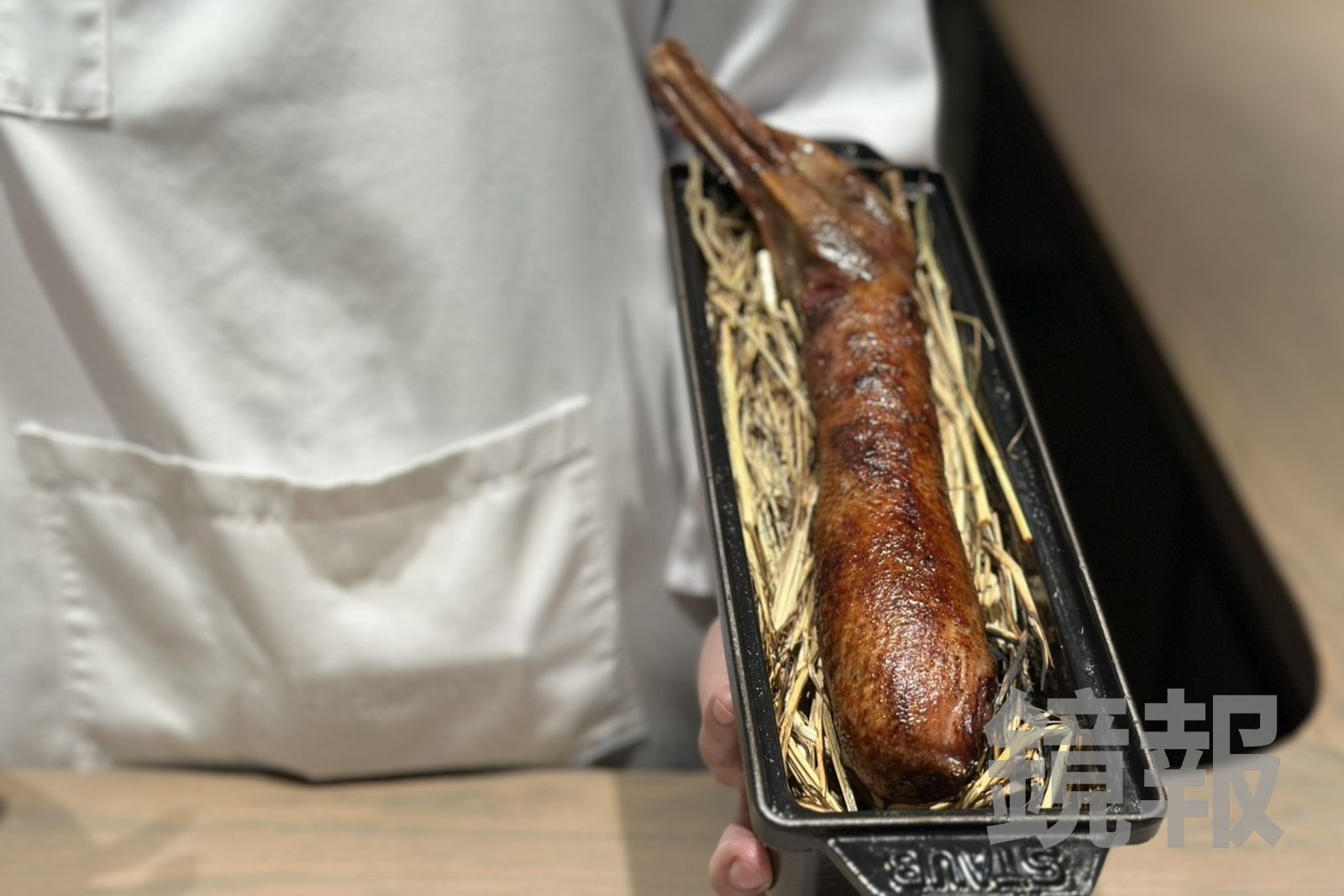 將櫻桃鴨腿油封後與雞胗、刺蔥等食材絞入鴨脖,風乾3天再炭烤而成,搭配風乾西瓜與百香果凝膠,濃郁鹹香中透出果酸清香,是一道極為費工的料理。