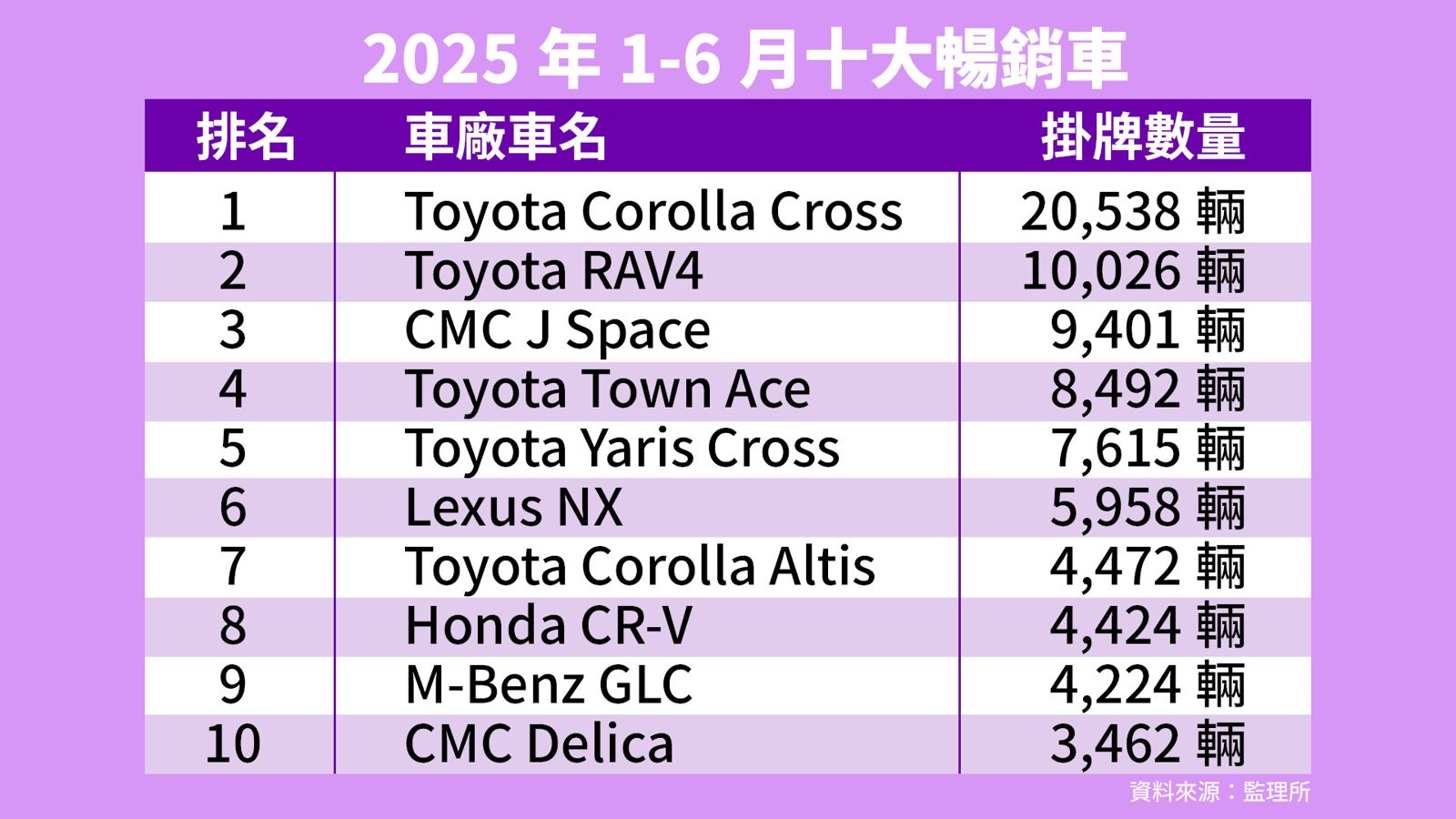 2025年1-6月台灣新車掛牌數為198,967輛,儘管車有百百款,但其中十大暢銷車的78,612輛就占去了四成。當中和泰汽車是大贏家,旗下的Toyota一個品牌一口氣霸佔五席、再加上Lexus NX後,Toyota集團車海便過半、囊括六席,而且NO.1的Toyota C-Cross國產中小型運動休旅車、NO.2的Toyota RAV4進口中型運動休旅車,更是唯二上半年累積銷售超過萬輛的超人氣車型。