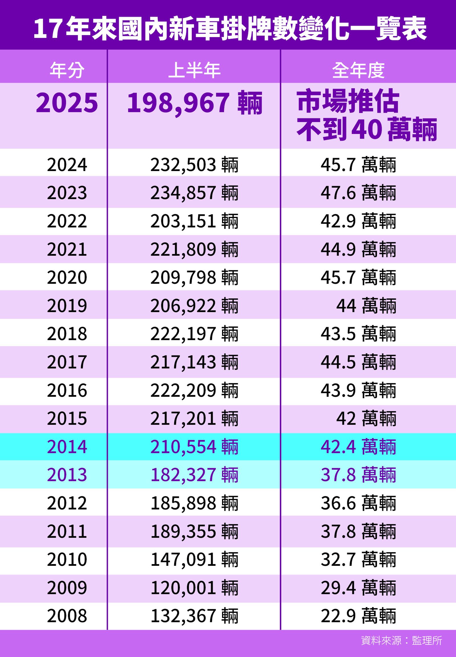 今年上半年車市颳起冷氣團,從本報取得交通部監理所資料、1-6月累計新車掛牌數不到20萬輛顯示,今年相較去年同期下滑了1成4。而該暖市的4月、該熱市的5月、該旺市的6月通通失靈,市場罪魁禍首就出在川普關稅政策和台美貿易談判,讓消費者產生關稅、貨物稅會大降,再等一下、晚點買車子會更便宜的預期心理,害慘車市,今年恐創下12年來,新車掛牌數首度跌破40萬輛的新低。