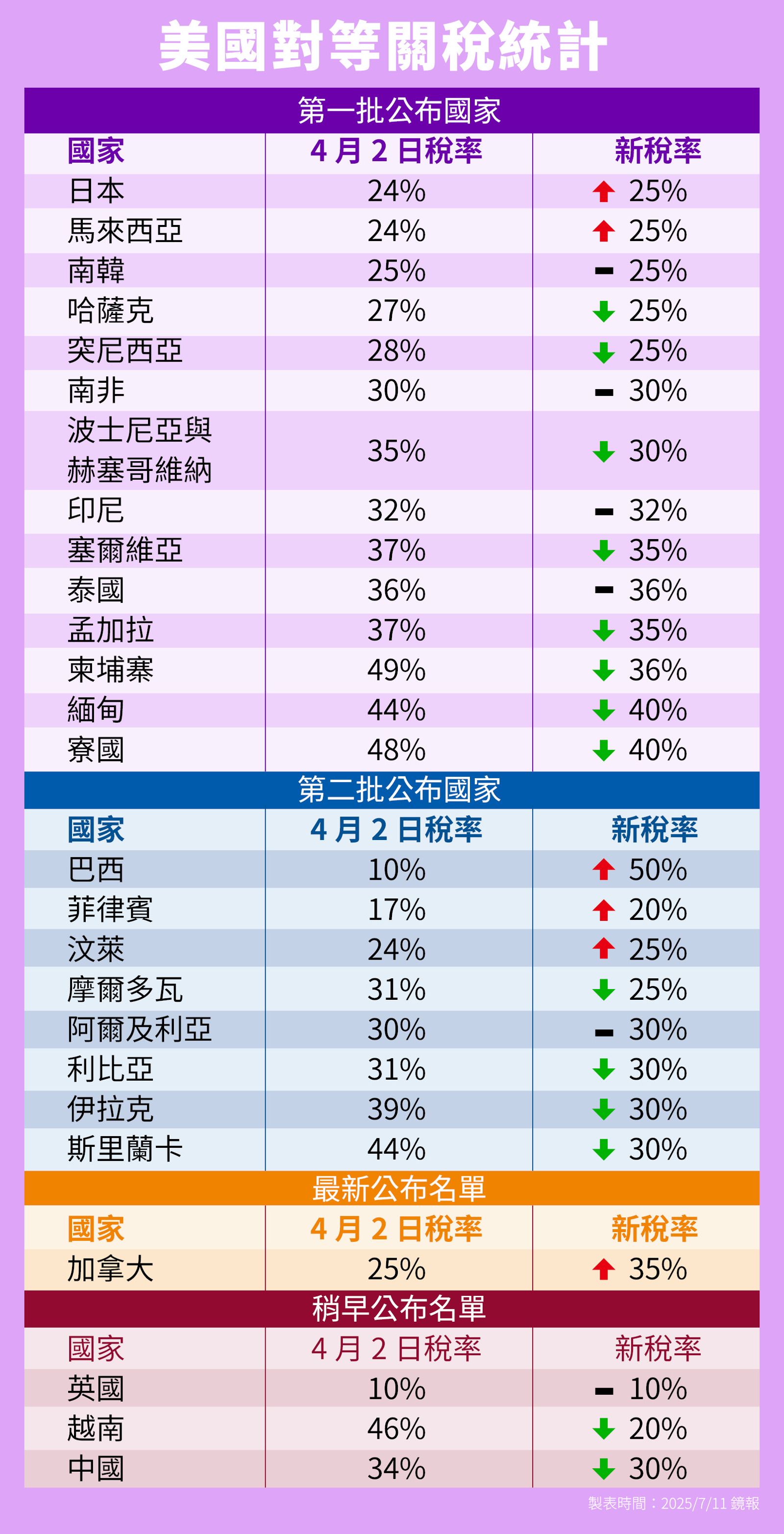 美國總統川普在台灣時間九日深夜再公布第二波的對等關稅的新關稅信名單,包括菲律賓等八個國家,將被可以20%不等的新關稅。其中巴西從原關稅10%升到50% 最令人驚訝,照川普的說法,這是為了懲罰巴西政府拘捕審判前任總統。