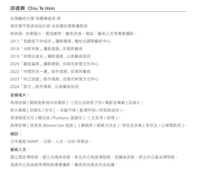 「那方—邱德興攝影個展」,以多重曝光的影像場域表現著奇幻的色彩與映像。即使是常見的樹木、植物、雲彩、海面等元素所構成,然而熟悉的物像,卻展現著一種不同於現實、不再隸屬於特定場址的非現實性,從現實中脱逃,創造不可能的知覺奇境。
