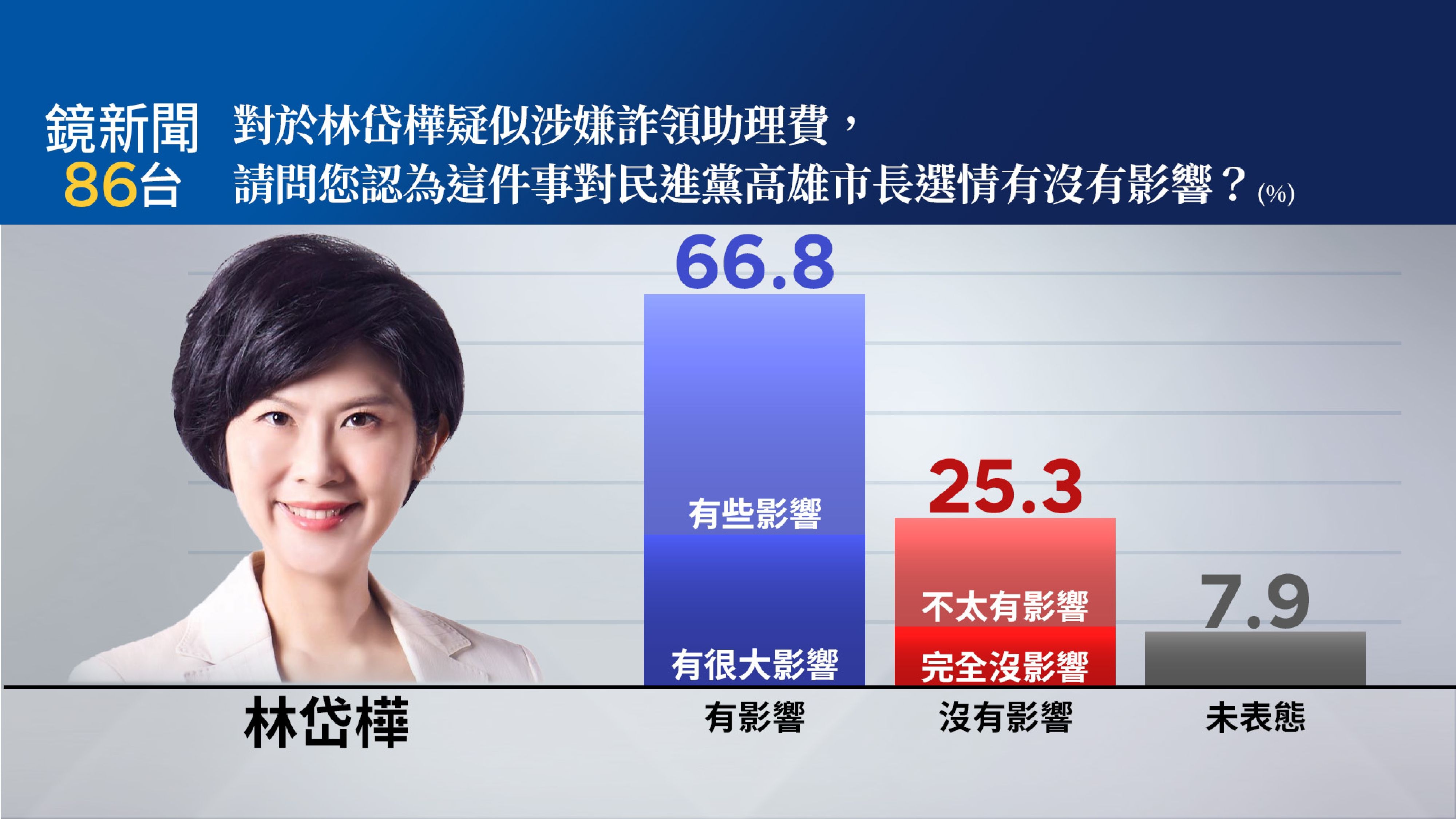 對於林岱樺疑似涉嫌詐領助理費,是否影響民進黨高雄市長選情?66.8%高雄市民認為有影響(25.0%有很大影響、41.8%有些影響)、25.3%高雄市民表示沒有影響(15.4%不太有影響、9.9%完全沒影響)。7.9%未表態。