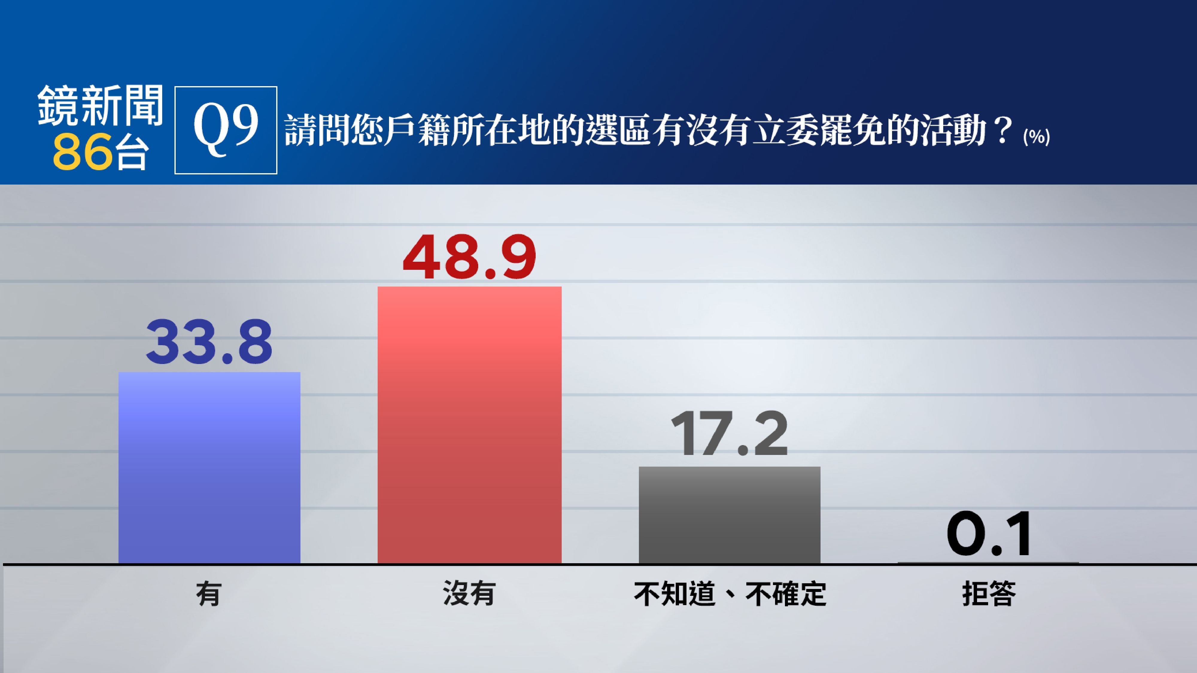 在全國立委大罷免方面,當被問及戶籍所在地是否有立委罷免行動時,有33.8%民眾表示「有」立委罷免的活動,48.9%民眾「沒有」,17.2%民眾表示不知道、不確定。