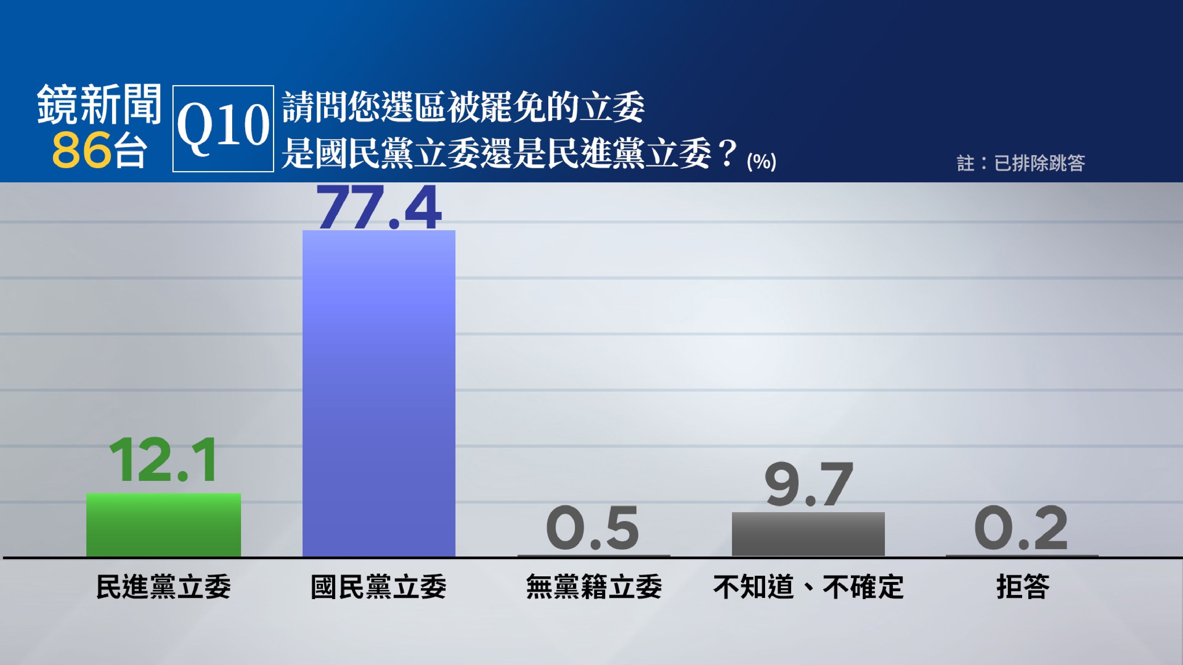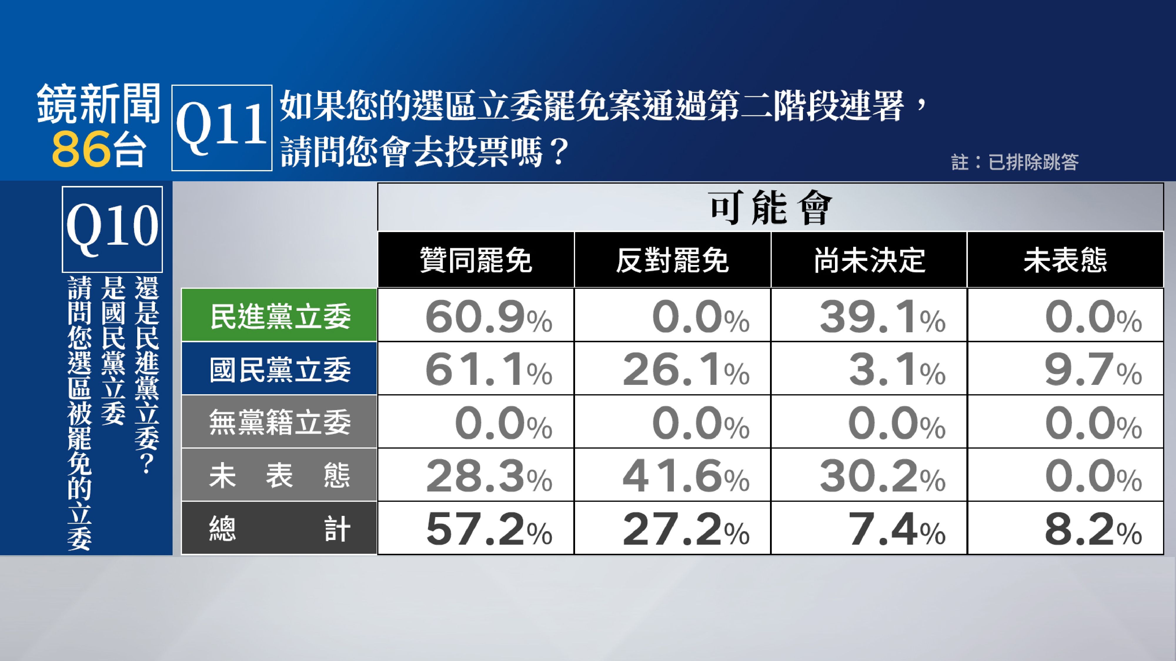 戶籍所在地有立委罷免活動的受訪者,77.4%表示為罷免「國民黨立委」,12.1%為罷免「民進黨立委」,0.5%為罷免無黨籍,未表態9.9%。如果選區立委罷免案通過第二階段連署,67.5%民眾表示會去投票(52.4%一定會、15.1%可能會),31.2%表示不會去投票(8.7%可能不會、22.5%一定不會),僅1.3%未表態。交叉分析顯示,罷免案成立民進黨支持者有85.3%會去投票、其中一定會去投票的高達69.6%;民眾黨支持者53.6%會去投票、國民黨支持者53.5%會去投票。
