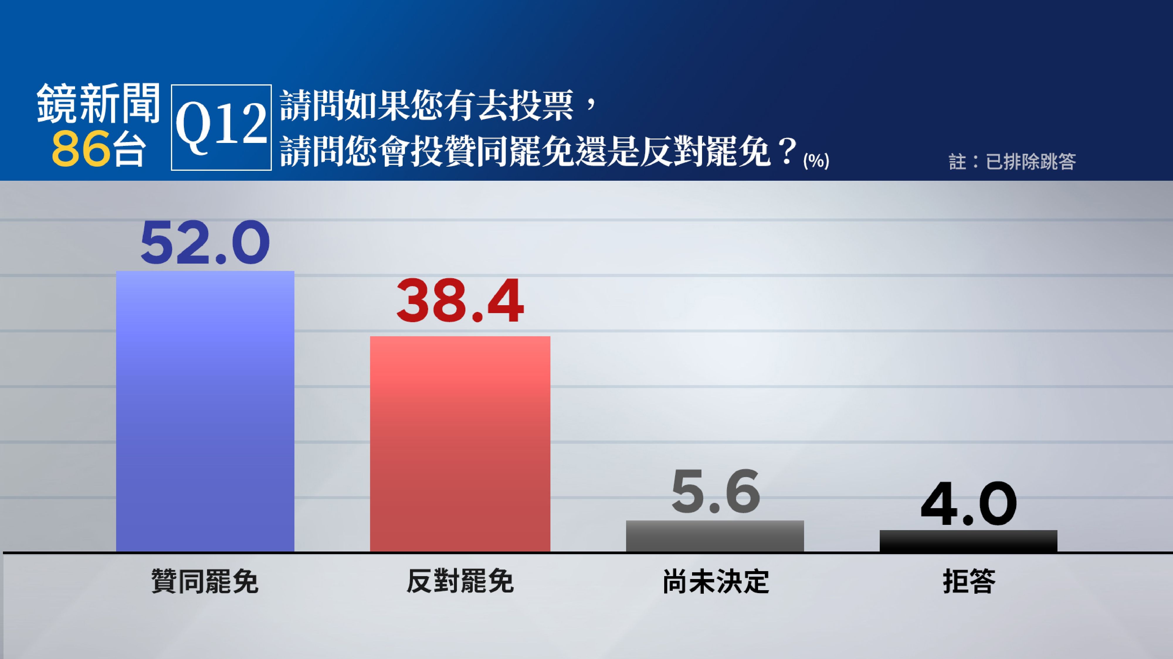 在表態會去投票的民眾當中,過半數52.0%會投「贊同罷免」,近四成38.4%會投「反對罷免」,9.6%未表態。經與政黨認同交叉分析,84.6%民進黨支持者贊同罷免、80.3%的國民黨支持者反對罷免、73.7%民眾黨支持者會反對罷免。