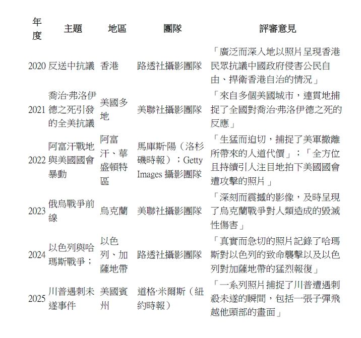 2020–2025年普立茲即時新聞攝影獎(Pulitzer Prize for Breaking News Photography)得獎作品比較表: