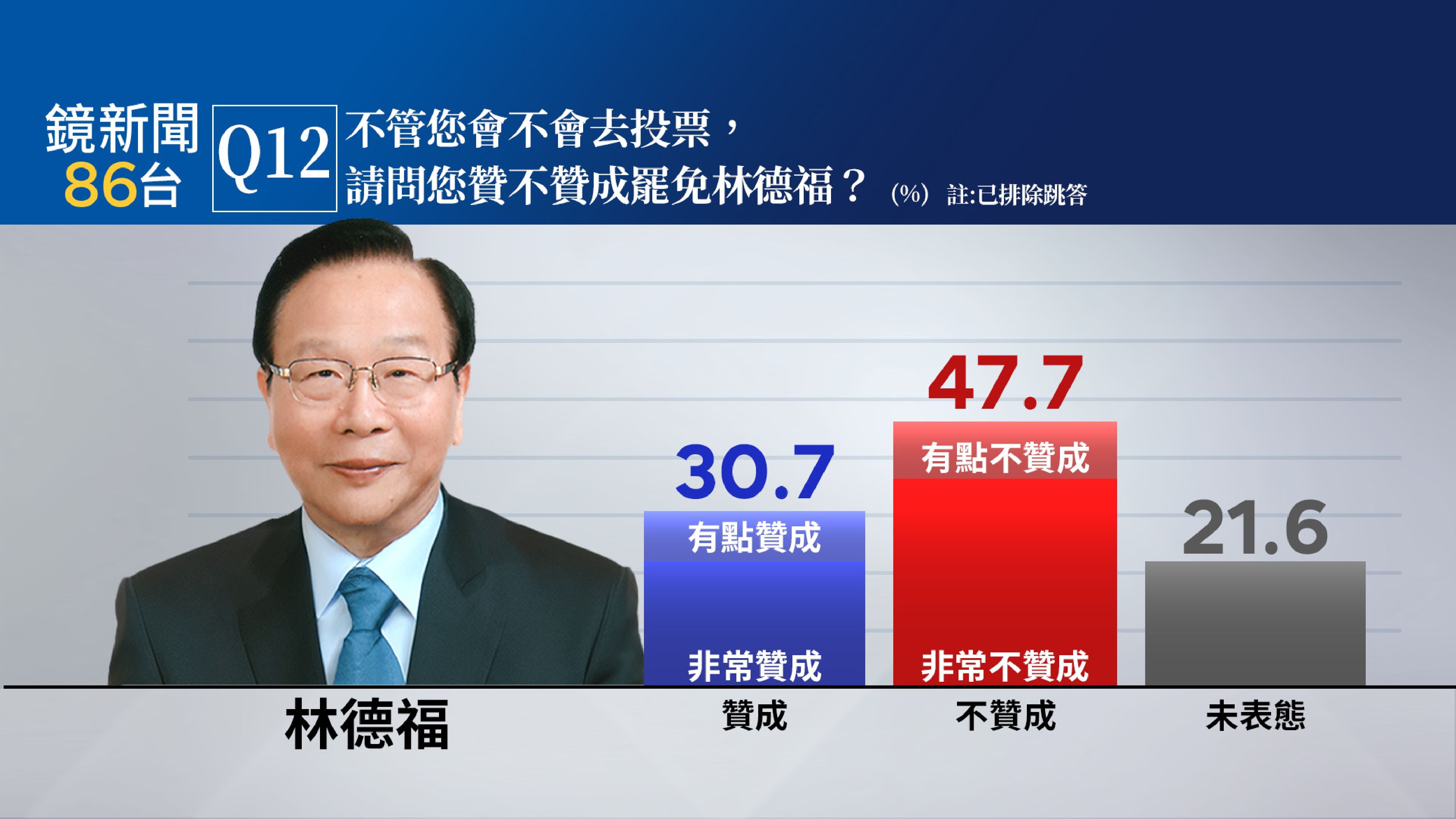 在國民黨立委林德福所屬的新北市第九選區(永和區)的罷免案,有60.9%的民眾會去投票(一定會去投票的民眾占46.3%、可能會投14.6%)、28.8%不會去投票(可能不會投15.0%、一定不會投13.8%)、未表態10.3%;而不管會不會投票,贊成罷免林德福的民眾30.7%(非常贊成21.3%、有點贊成9.4%)、47.7%不贊成罷免(有點不贊成12.0%、非常不贊成35.7%)、未表態21.6%。