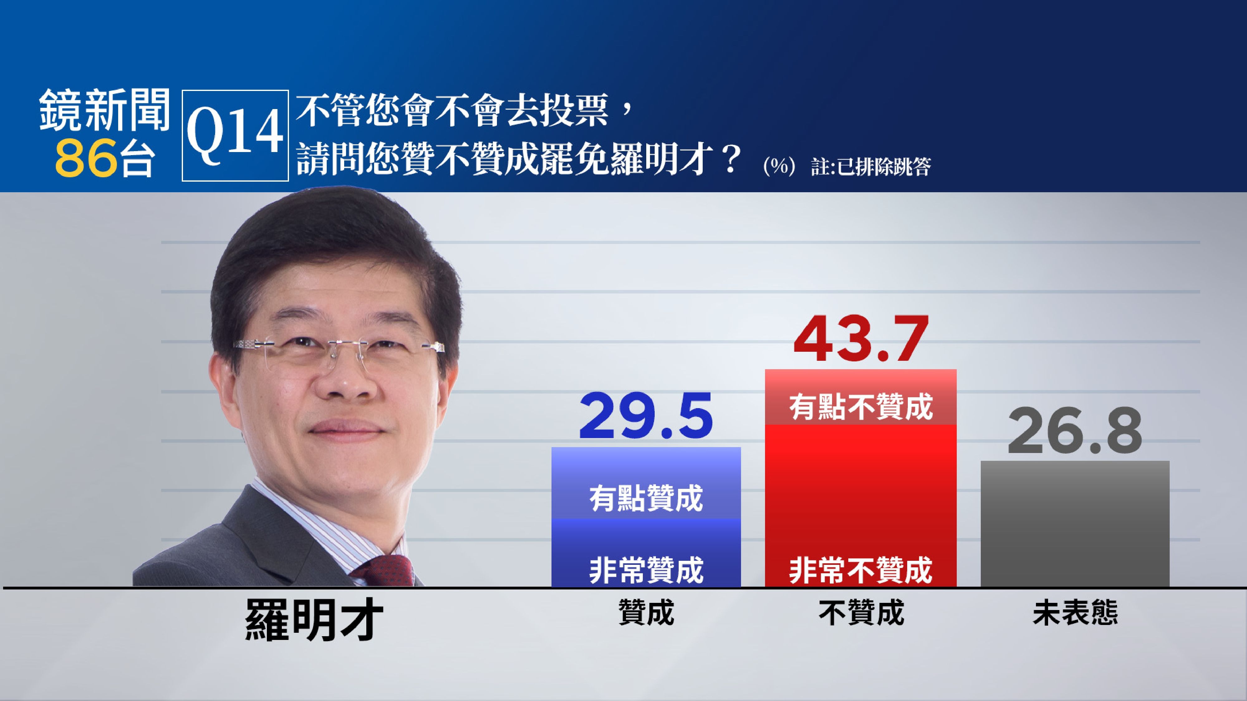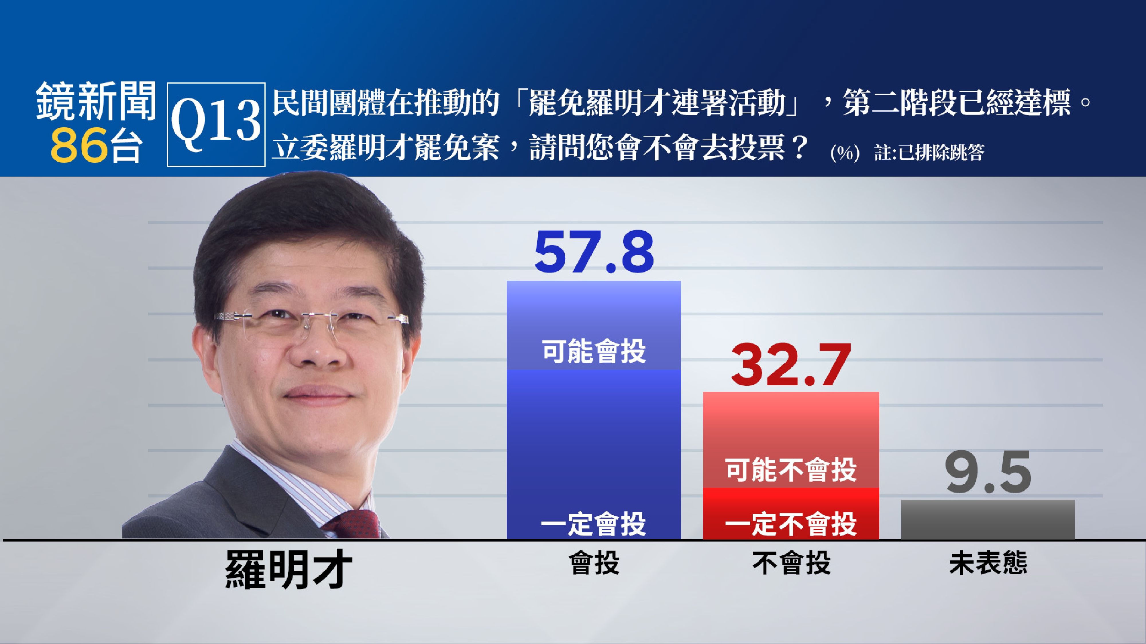 在國民黨立委羅明才所屬的新北市第十一選區(新店區)的罷免案,有57.8%的民眾會去投票(一定會去投票38.1%、可能會投19.7%)、32.7%表示不會去投(可能不會投21.2%、一定不會投11.5%)、未表態9.5%;而不管會不會投票,29.5%贊成罷免羅明才(非常贊成罷免13.7%、有點贊成15.8%)、43.7%不贊成罷免(有點不贊成11.0%、非常不贊成32.7%)、未表態26.8%。