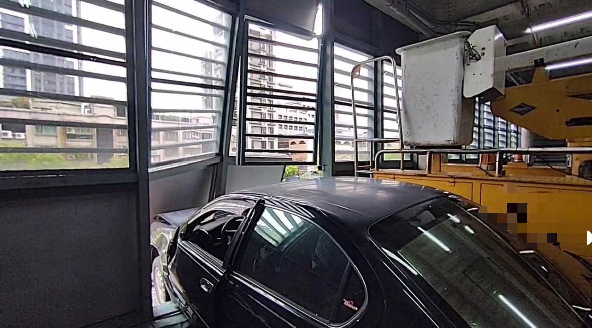 新北板橋台電大樓設有多樓層停車場,今2樓外牆突然高掛一輛自小客車,肇事駕駛張翁稱,在準備停車時,為了閃車誤踩油門,才會暴衝撞破停車場外牆,所幸張翁未受傷自行脫困。