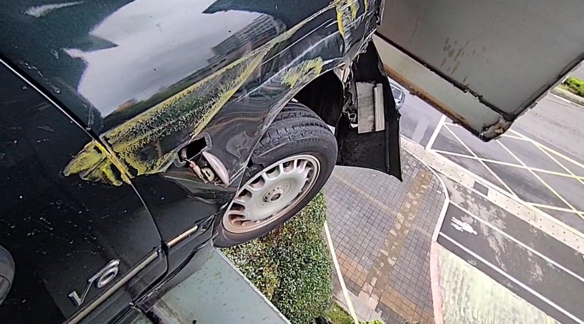板橋警分局今上午11時50分獲報,趕到現場時發現暴衝車輛高懸2樓外牆,前輪在空中晃,初步釐清張翁持照狀況正常,已將人帶回警局釐清肇因。