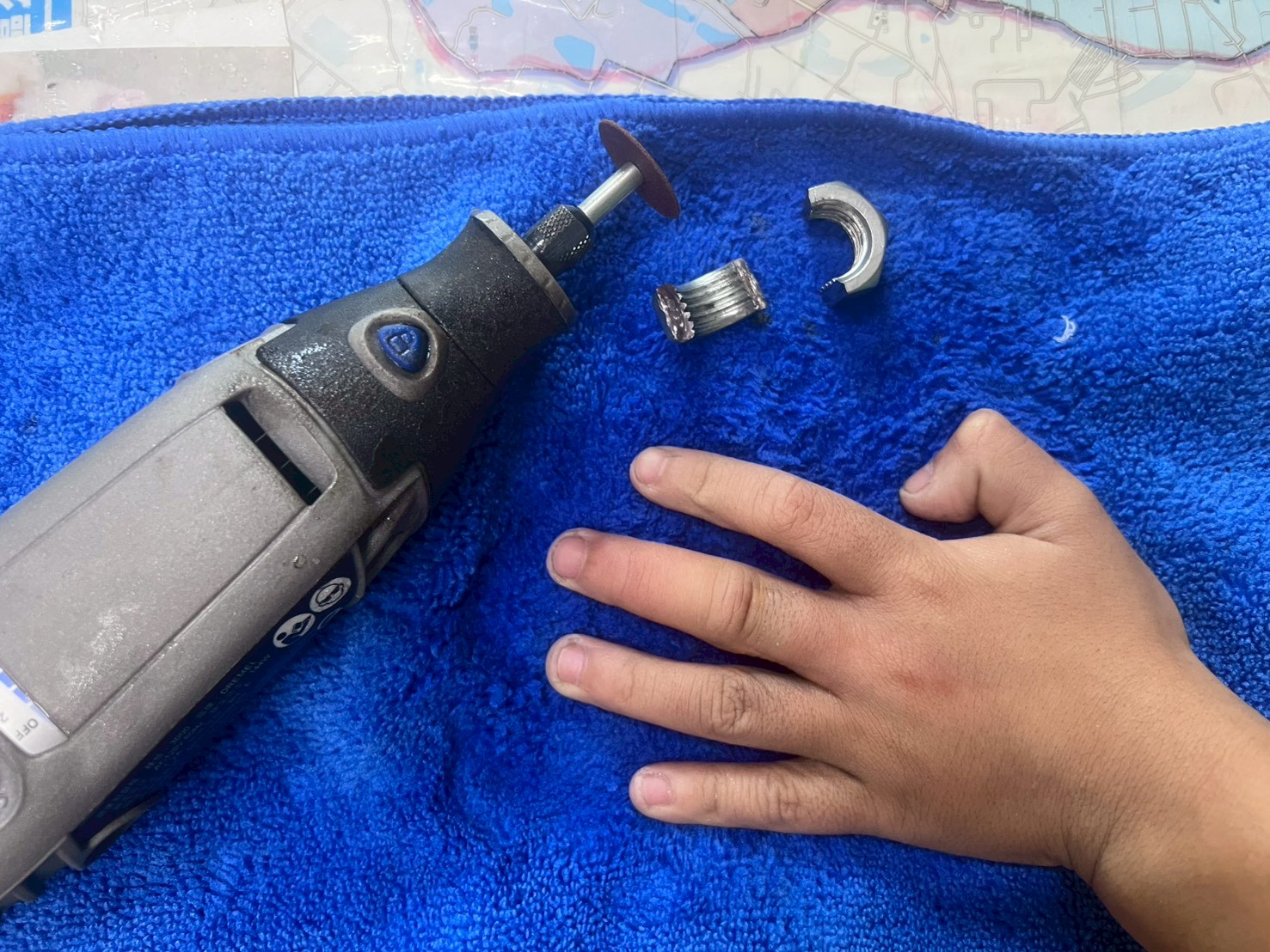 消防人員一邊安撫男童情緒,一邊分工進行處置,先以冰敷減緩腫脹,再利用吸管製作保護墊片隔離金屬,並持續以生理食鹽水降溫,同時為男童配戴護目鏡,確保安全。由於一般工具無法破壞螺帽,最終動用鄉親捐贈的刻磨機進行細部切割,過程謹慎且繁複,歷經1小時45分後,螺帽終於順利鬆開脫離,男童手指成功解困,眾人也鬆了一口氣。