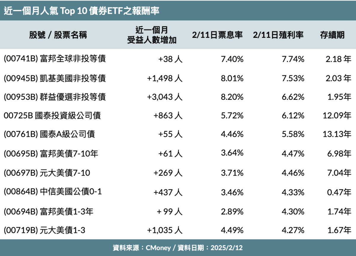 隨著川普關稅戰開打,推升市場對通膨疑慮,十年期公債殖利率週三(12日)彈升近 2%,反映在債市交易上,近一個月受益人數增加 Top 10 的債券ETF中,有 6檔是存續期間介於1~5年間的短天期債券,而有 5檔的殖利率約落在 5%之上;其中,又有 3檔的年化殖利率相對突出、同時票面利率也相當高,包括富邦全球非投等債(00741B)的 7.74%、凱基美國非投等債(00945B)的 7.53%、群益優選非投等債(00953B)的 6.62%。