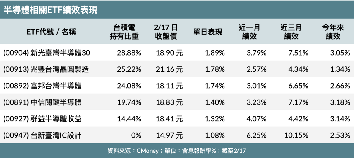 據 CMoney 統計,截至週一,國內 6檔半導體相關ETF近一個月、三個月來績效表現強勢,含息報酬全數領先大盤;若以昨天的單日漲跌幅來看,可發現具高含積量的半導體ETF,如新光臺灣半導體30(00904)、兆豐台灣晶圓製造(00913)、富邦台灣半導體(00892)等,單日績效表現也均凌駕大盤。