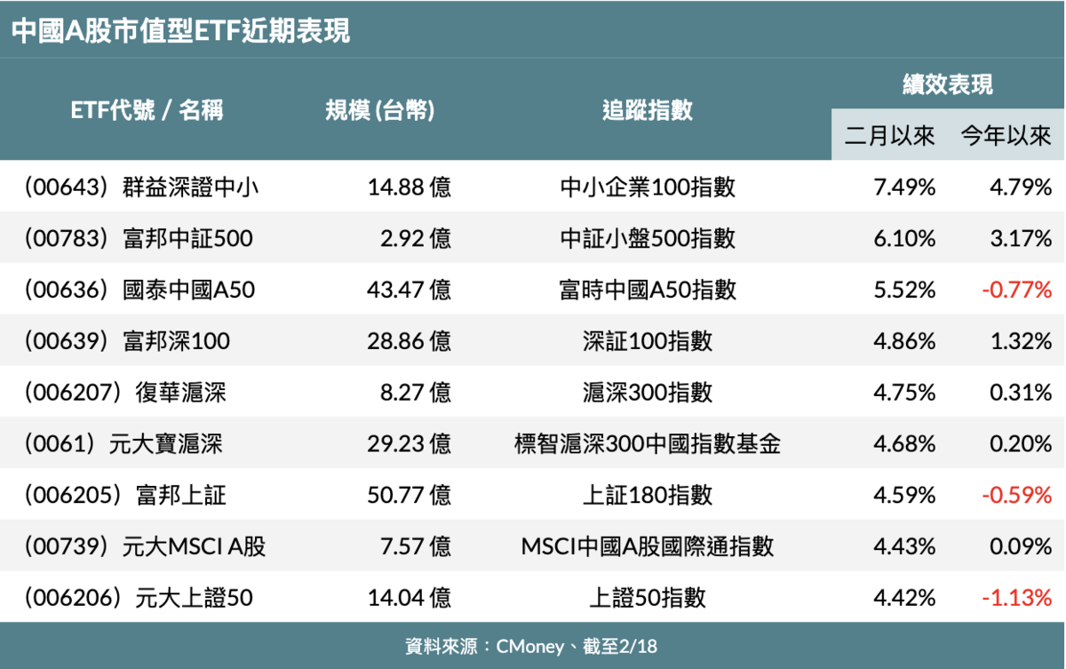 二月份以來,深圳綜合指數上漲 5.04%、上海綜合指數上漲 2.27%,連帶讓中國A股市值型ETF本月績效出現水漲船高表現。統計至2月18日,包含 00643、00783、00636 等在內,共計 9檔中國A股市值型ETF產品,自二月以來全數繳出正報酬佳績,且漲幅均於 4%之上。