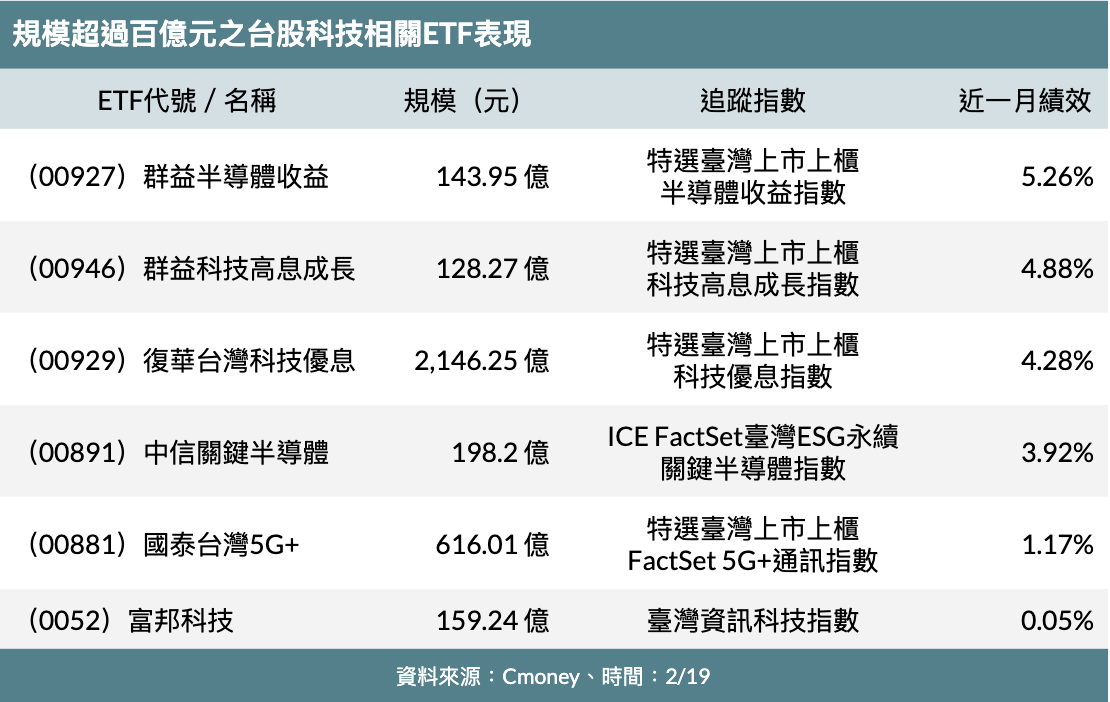 觀察近期規模超過百億以上之台股科技題材ETF表現,包含市值、高息等在內共計 6檔,近一月皆繳正報酬表現。其中,以日前順利完成填息的群益半導體收益(00927)表現最好,近一月累計漲 5.26%,參與此次除息的投資人可說是股息、資本利得兼得。