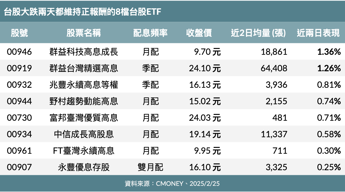 美國總統川普重申,對加、墨兩國的加徵關稅將如期實施,加深市場擔憂「貿易戰」升溫,美股持續震盪、台股本周也難逃跌勢。在短短前兩個交易日,台股大盤蒸發了 444.53點,跌幅 1.87%。但擁有一籃子台股的台股ETF績效仍有標的發揮「抗跌」本領,逆勢走漲。統計原型台股ETF中,共有 8檔這兩天均維持正報酬。