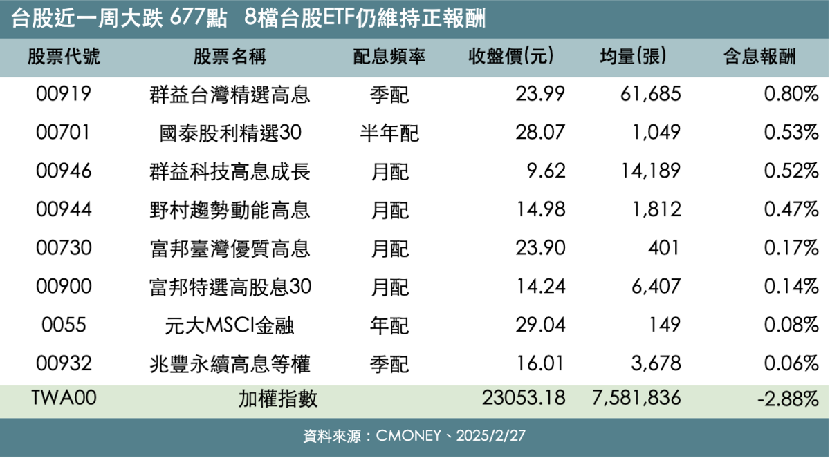 進一步觀察這 55檔台股ETF,最有人氣的高股息族群亦相對抗跌,包含群益台灣精選高息(00919)、國泰股利精選30(00701)、群益科技高息成長(00946)等 8檔在大盤大跌時仍維持正報酬,其中 00919 的漲幅逆勢上揚 0.85%居冠。