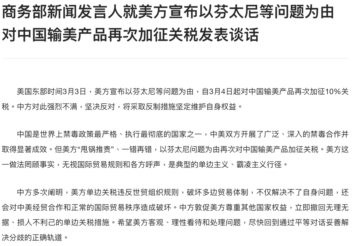 根據中國商務部發表聲明,美方宣布以芬太尼等問題為由,今日起對中國輸美產品再加徵 10%關稅。中方對此強烈不滿,堅決反對,將採取反制措施堅定維護自身權益。並表示,中國是世界上禁毒政策最嚴格、執行最徹底的國家之一,中美雙方進行了廣泛、深入的禁毒合作,並取得顯著成效。但美方「甩鍋推責」、一錯再錯,以芬太尼問題為由再次對中國輸美產品加徵關稅。美方這一做法罔顧事實,無視國際貿易規則和各方呼聲,是典型的單邊主義、霸凌主義行徑。