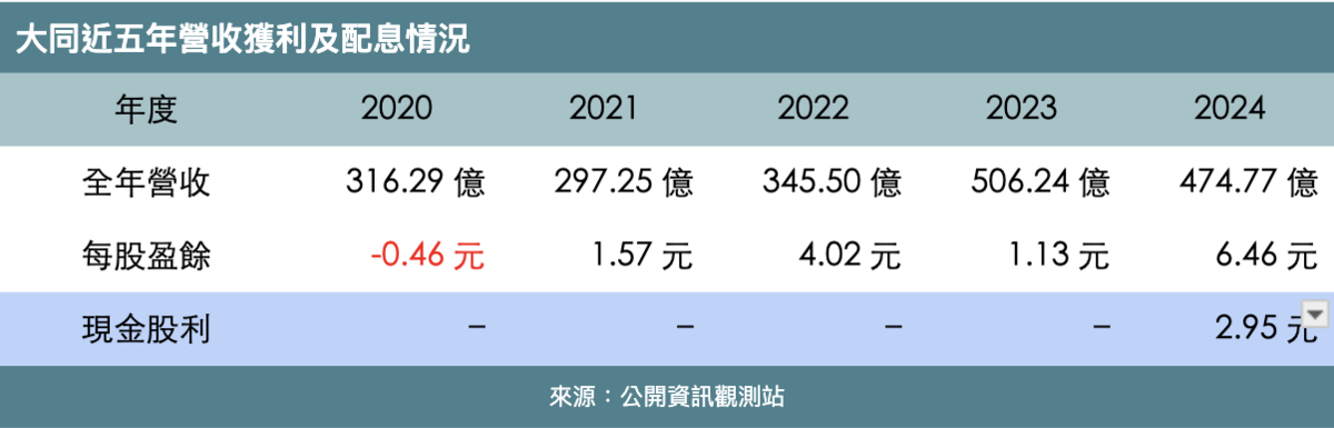 先前外界預估,大同EPS在 6元上下、配息約 2.5元,昨日實際公布的年度獲利、股利政策均優於市場預期。此外,日前大同董事會日前通過現金減資案,擬每股退還 0.5元,將於3月17日召開股東臨時會表決,若能通過該案,加計股利及減資退還現金,兩者合計將達 3.45元。