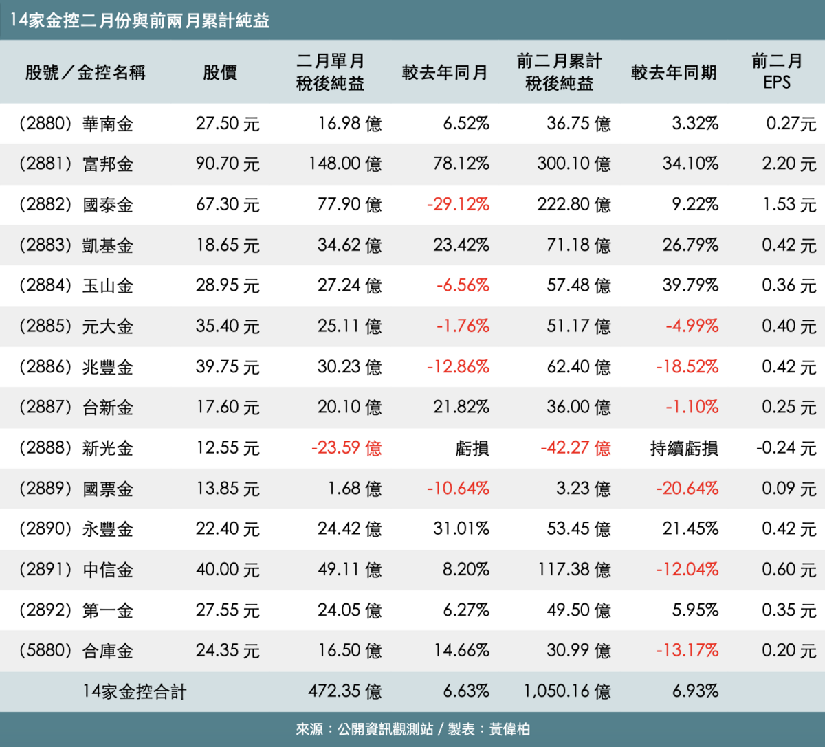 二月份14家金控自行結算獲利已全出爐。合計稅後獲利為新台幣 472.35億元、年成長 6.63%,累計前兩個月共賺進 1,050.16億元、年增 6.93%。其中,壽險金控「雙雄」富邦金(2881)、國泰金(2882)的前兩月累計稅後獲利排名位居前二,而中信金(2891)雖為第三名,但前兩月累計較去年同期衰退了 12%。《新頭殼》為金融存股族整理各金控獲利,一表列出獲利與成長率排行。