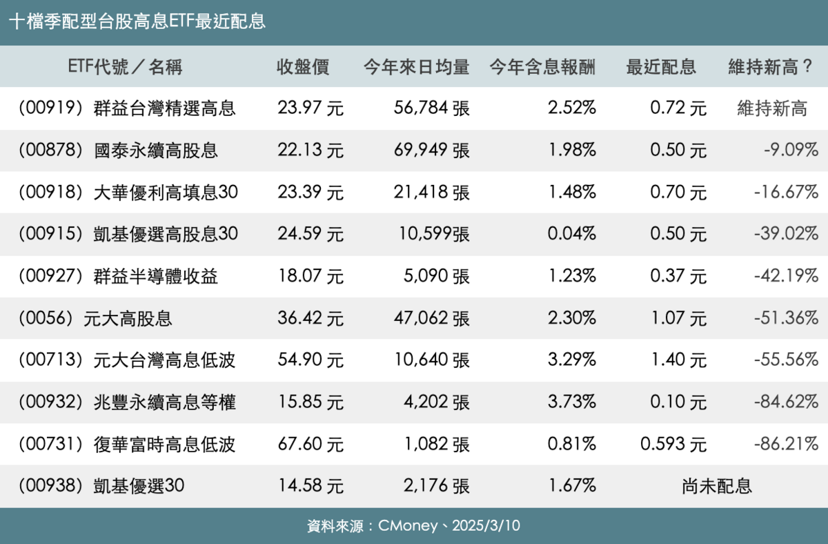 攤開 10檔季配型台股ETF,觀察最近一次配息金額表現。其中,擁有超過 108萬受益人的群益台灣精選高息(00919),配息金額維持歷史新高,成了唯一一檔配息不降的台股ETF。此次依舊配出 0.72元,預估年化配息率 12.11%,為連續八季衝破 10%,除息日為3月18日,最後參與的買進日為3月17日。