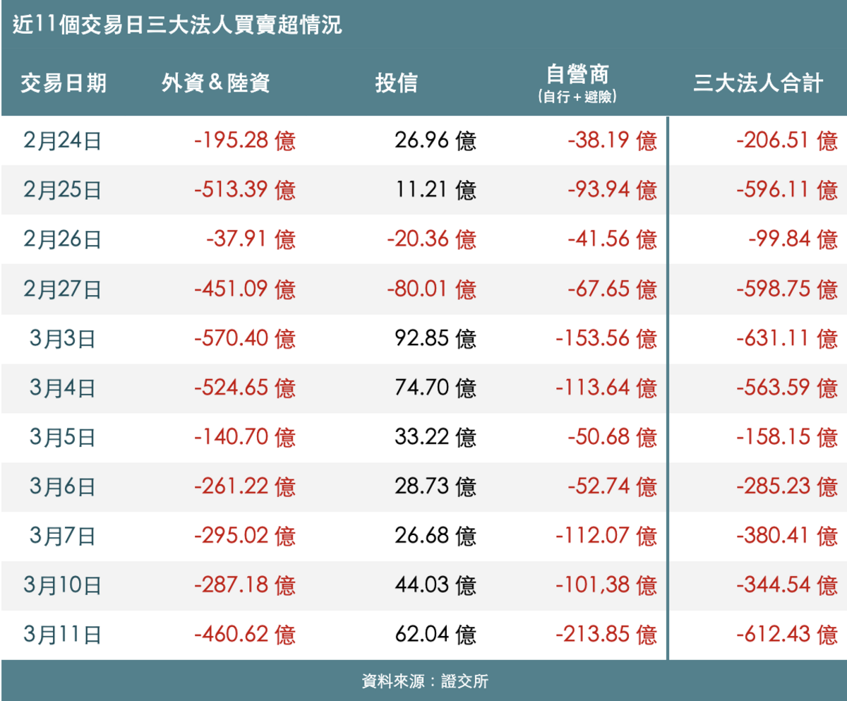 今(11)日,三大法人合計賣超台股 612.43億元,其中外資續砍 460.62億元,賣超金額登上今年第六大,累計連續11個交易日賣超,提款了近 3,737.46億元。另外自營商也狂賣超 213.85億;唯獨投信買超 62.04億元,為「連 7買」。