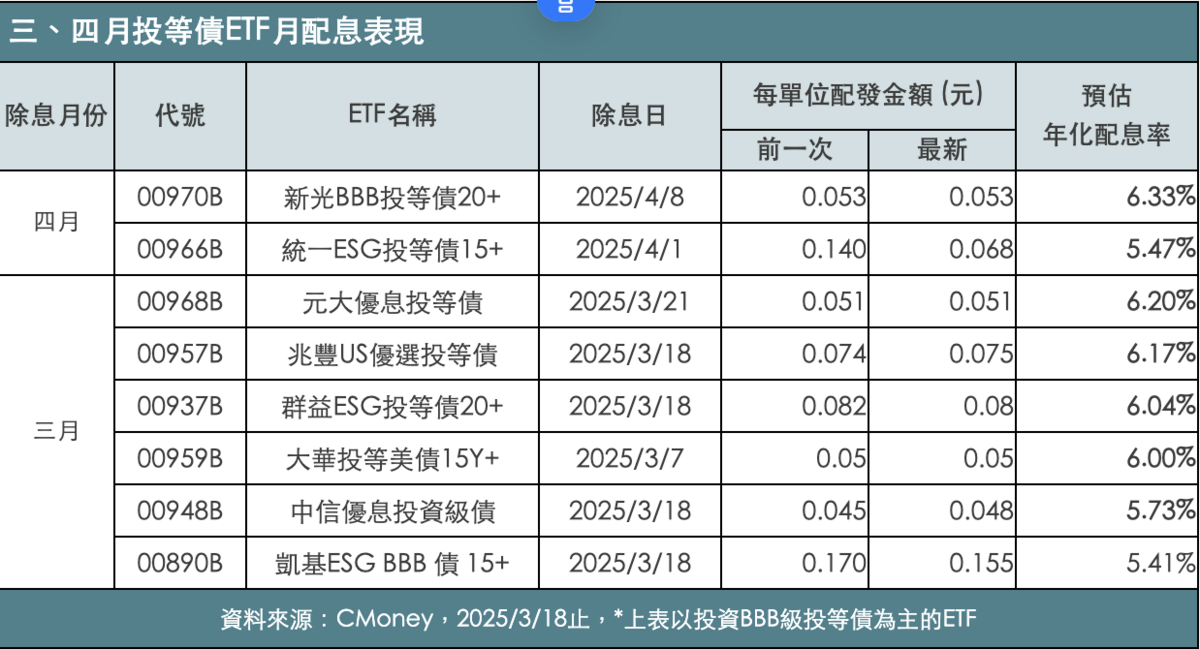 據 CMoney 統計,向來訴求穩健收益的投等債ETF,今年來整體年化配息率表現穩健,以四月將除息的投等債ETF來看,包含新光BBB投等債20+(00970B)、統一ESG投等債15+(00966B)兩檔已於3月18日率先公告每單位配發金額,分別為 0.053元及 0.068元。換算 00970B 的年化配息率有6.33%、00966B 亦有 5.47%;至於三月已完成除息的投等債ETF中,00968B、00957B、00937B 及 00959B 等,年化配息率也皆有逾 6%水準。