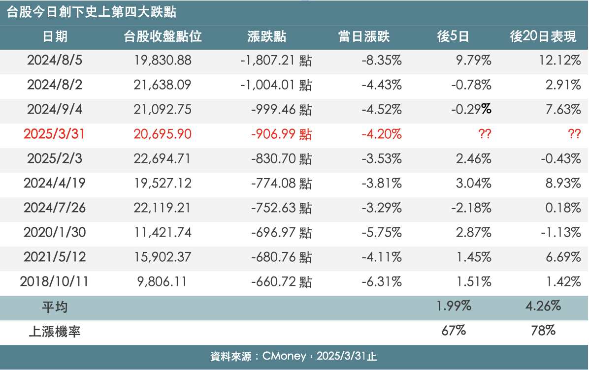 雖今日大盤急殺逾 900點,指數創下第四大跌點。不過若從過去統計數據來觀察,台股在創下前十大跌點後的時間,指數漲多跌少。據 Cmoney 統計,在過去十大跌點中,台股於後續股價表現,平均後 5 日漲 1.99%,後 20 日漲 4.26%,上漲機率分別為 67%、78%。第一金投信指出,儘管股價短線急殺,但台股企業仍具備獲利動能,與 AI 科技成長體,後續待消化川普關稅政策疑慮後,股價仍可望回復基本面表現。