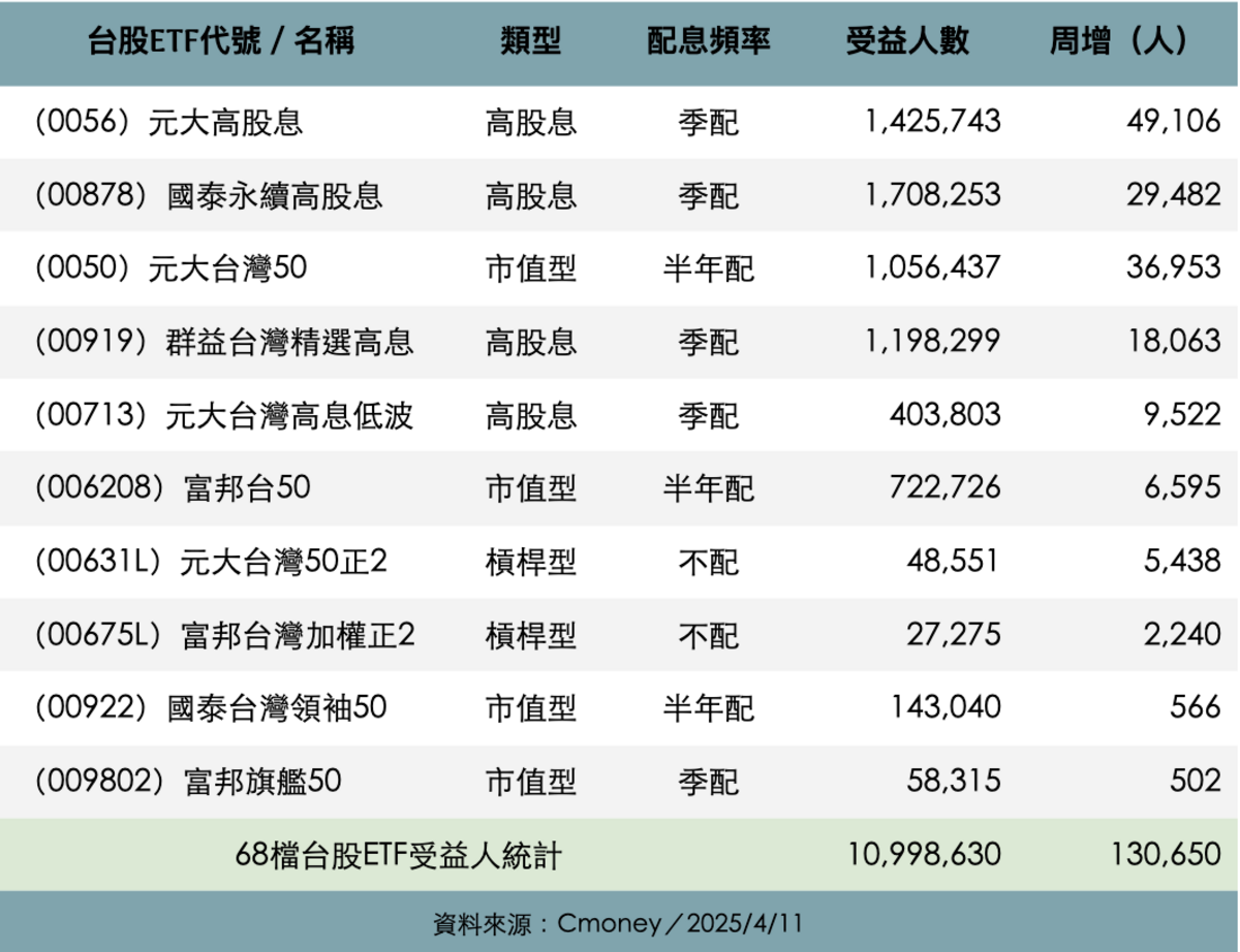 川普掀起的關稅之亂,讓台股上周大跌 8.31%,甚至低點來到 17,306點。不過台股ETF投資人仍持續湧入,人數創下新高。據集保戶股權分散 4 月 11 日最新統計,68檔台股ETF受益人周增 130,650人,今年來共增加了 772,794人,總人數來到 10,998,630人,為連六周創新高。