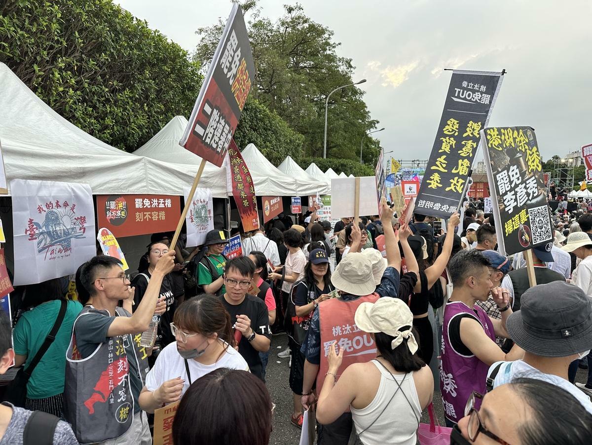 由反共網紅八炯等人號召的「拒絕統戰,守護台灣」大會,今(19日)下午在凱達格蘭大道舉行,35個罷免藍委的團體也在現場擺攤,力拚二階段連署。率先登台開講的八炯表示,自由民主是許多前輩用血淚爭取而來,攘外必先安內,必須清除立院的中共同路人,才有對抗中共的可能。下午4時左右,主辦單位指現場已超過4萬人,稍早,主辦單位更新現場已達5萬人。前議員呱吉表示,現場人山人海,絕對比前兩天台北地檢署外的人多,但如果加上死亡連署的人,我們就比較少了,死亡連署帶給內政部很大問題,可能要請師公才能傳喚人作證。