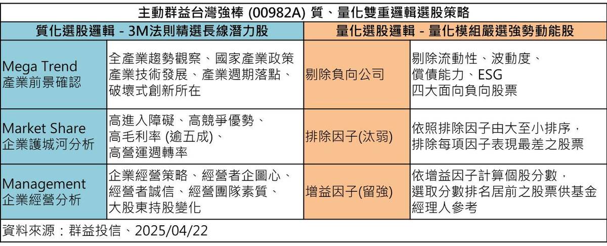 00982A 在操作上,採質、量雙邏輯並重,在質化選股方面,採取「3M」法則來進行篩選,首先為 Mega trend 產業前景確認,即觀察與分析產業趨勢、國家產業政策、產業技術發展、破壞式創新所在等等,來先掌握產業發展利基,再透過企業護城河分析(Market Share)與企業經營分析(Management),深入探究企業競爭優勢、獲利能力、經營策略與團隊素質等等,挖掘長期股價潛力股。