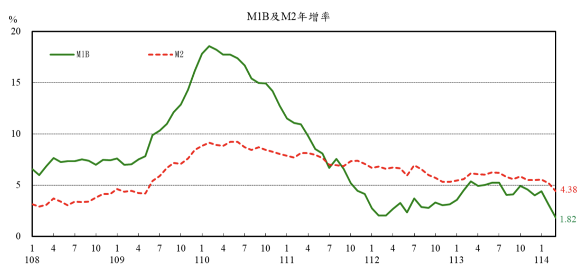 而當民眾可隨時動用的資金(M1B)年增率,扣除整體市場的資金(M2)年增率為大於 0%,表示流動資金的成長較定存快;反之,當 M1B 年增率扣除 M2 年增率小於 0%,代表流動資金的成長比定存慢。