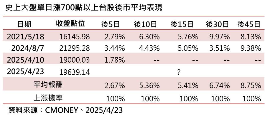 據群益投信台股主動ETF團隊統計,台股有史以來 4度出現單日漲點達 700點以上,統計前三次大盤後 5日、10日、15日、30日、45日之上漲機率為百分百,平均漲幅表現分別為 2.67%、5.36%、5.41%、6.74%、8.75%,不但正報酬,且平均漲幅逐漸向上表現亮麗。法人建議,現階段全球市場高檔震盪,在看好台股後市下,面對瞬息萬變的市場環境,投資人要與時俱進調整投資思維,主動出擊應萬變。