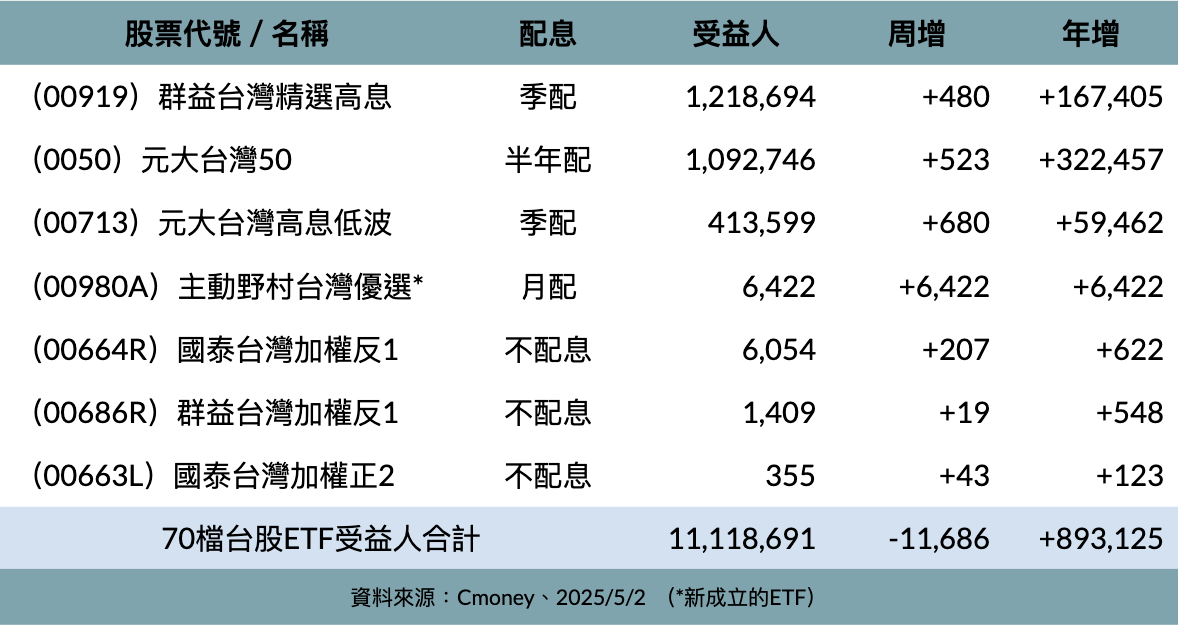 進一步觀察單檔表現,有 7檔受益人逆勢創高。以總人數排名來看,分別為群益台灣精選高息(00919)、元大台灣50(0050)、元大台灣高息低波(00713)、主動野村臺灣優選(00980A)、國泰臺灣加權反1(00664R)、群益臺灣加權反1(00686R)、國泰臺灣加權正2(00663L)。除了兩檔高股息型上榜外,新成立的主動式台股ETF「主動野村臺灣優選」(00980A)擁有受益人數 6,422人,也使台股ETF總檔數來到 70檔。
