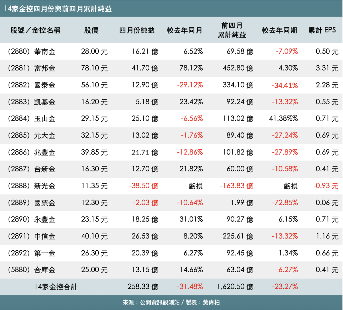 由於四月整體獲利縮水拖累,14家金控累計前四個月共賺了 1,622.49億元,年減 23.18%。其中僅富邦(2881)、玉山(2884)、永豐(2890)、第一(2892)等 4家金控獲利還比去年同期有成長;衰退最多的,則是國票金(2889)的 -293.33%,該金控四月也出現虧損。《新頭殼》也為投資人整理金控獲利,一表看懂各家成長率及每股 EPS 排名。
