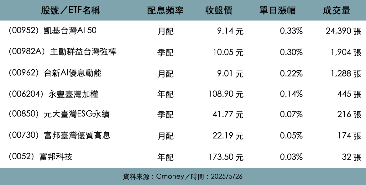 美國總統川普警告蘋果、三星等手機大廠若不將生產線遷回美國,恐將面臨 25%關稅。同時,美國與歐盟的貿易談判毫無出現進展,惹得川普揚言「6 月 1 日起加徵 50%關稅」,市場對貿易戰升溫的擔憂加劇。雖川普之後態度轉彎,把對歐盟加稅延至 7 月 9 日,但還是讓台股週一(26日)下跌 115.67點,連帶台股ETF的表現也是跌多漲少。