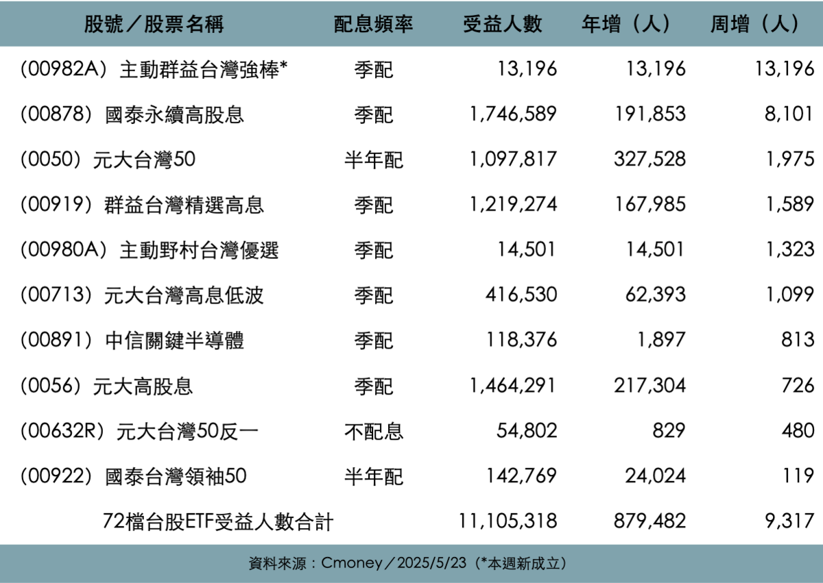 近期台股回檔,且端午節前觀望氣氛濃厚。不過根據集保戶股權分散截至 5 月 23 日最新統計,台股ETF終止連 3周投資人氣流失,整體72檔的受益人數上周增加 9,317人,今年來已增加 879,482人,總人數來到 11,105,318人。
