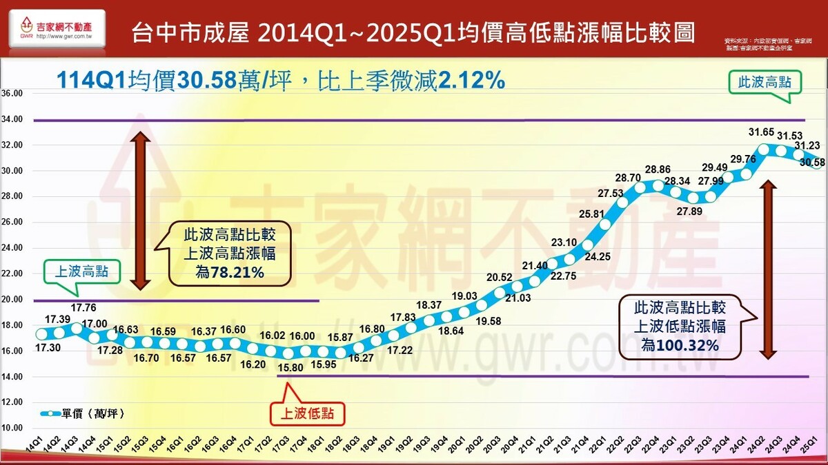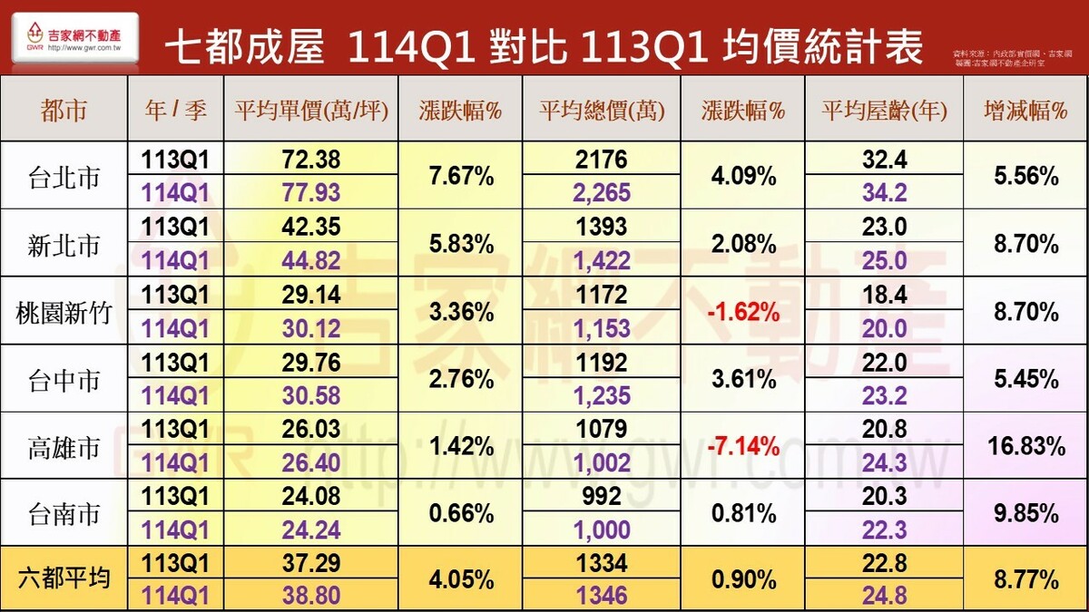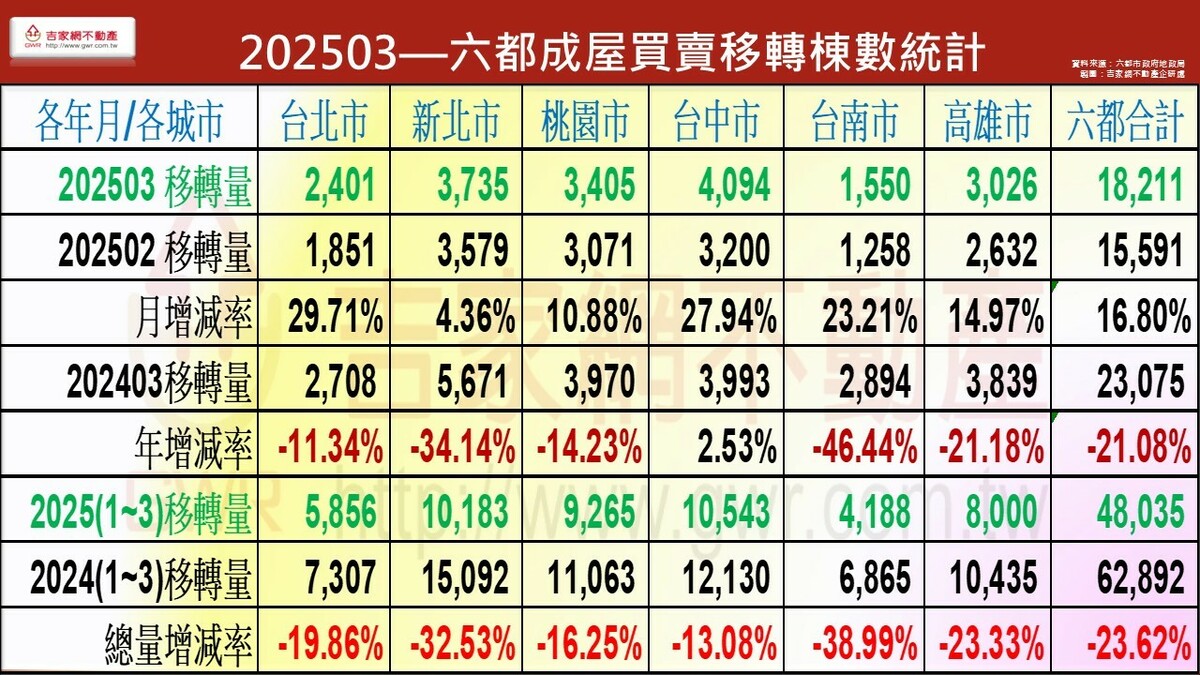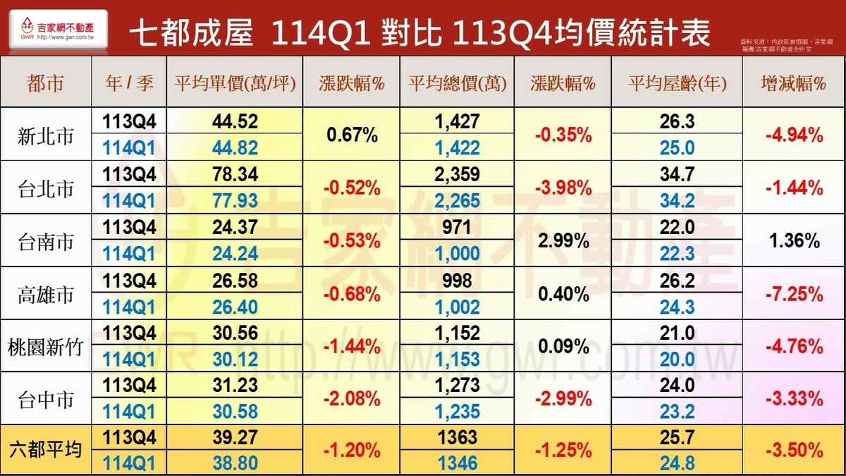 吉家網公布2025 Q1第一季房市季報,七都房市表現價量俱跌,六都均價微跌1.2%,六都季交易量62,892棟創九年來新低,各都房價表現除新北市仍小漲0.67%外,其餘五都呈現小跌,不同於上季台南、高雄領跌,今年第一季為台中、桃園領跌,分居前二名。吉家網董事長李同榮示警,六都均價與交易量連續兩季下跌,空頭明顯確立,全台房市由南至北、由多轉空,進入下修階段。