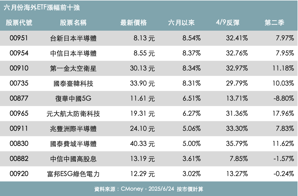 近期市場雖受中東戰火干擾、漲跌震盪劇烈,但關稅談判整體朝向正向發展。據 Cmoney 統計,六月份包括半導體、太空衛星、陸股等三大類海外ETF表現最亮眼。另 2檔鎖定日本的半導體ETF——台新日本半導體(00951)、中信日本半導體(00954),及台灣唯一純太空ETF第一金太空衛星(00910)以及國泰臺韓科技(00735)等,六月以來股價漲幅皆逾 8%,表現最為強勢。
