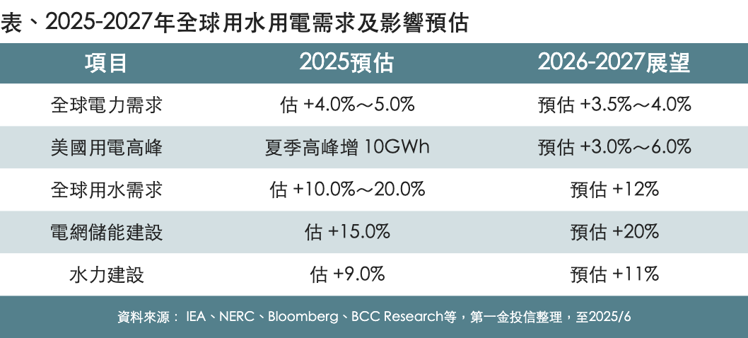 此外,全球 AI 發展勢如破竹,再加上全球熱浪,國際能源總署(IEA)預估,今年全球電力的需求將進一步上升 4%~5%,用水需求則成長 10%~20%,用電激增考驗電網設備承載量帶動擴建需求,用水壓力則帶來水源調度及智慧用水等發展,需求動能也帶來投資成長潛力。