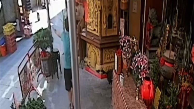 6日下午1時許,一名身穿綠色上衣的男子,突然來到宮廟廟埕前,先是拿了一大把香,接著朝著開始「神舞」,時而朝著天舞動雙手,時而在胸前旋轉著雙手,結束後才上前點香,然後又是一陣「舞弄」;綠衣男還沒結束,下一秒突然暴砸用來點香、點金紙的打火機,甚至到洗手間搞破壞。