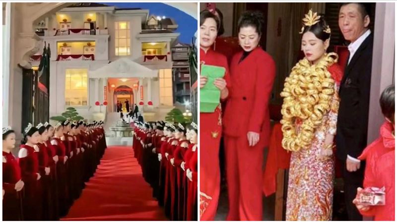 而新娘子也是一身大紅色的中國傳統服飾,脖子上掛著的上百個龍鳳鐲。綜合陸媒,這場婚宴辦在福建莆田市北高鎮埕頭村,葉家在當地是大家族,族內宗親多以珠寶黃金產業謀生。新郎的父親被傳是著名的閩商代表、知名珠寶公司董事長,光婚宴花費高達2.1億人民幣(約新台幣9.26億元),但未獲證實。