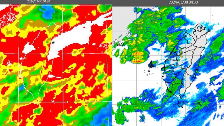 ▲圖:今(30日)晨4:20紅外線色調強化雲圖顯示,台灣上空的雲層,大多為結構鬆散的中高雲(左圖);4:30雷達回波合成圖顯示,台灣上空的雲層伴隨弱降水回波(右圖)。
