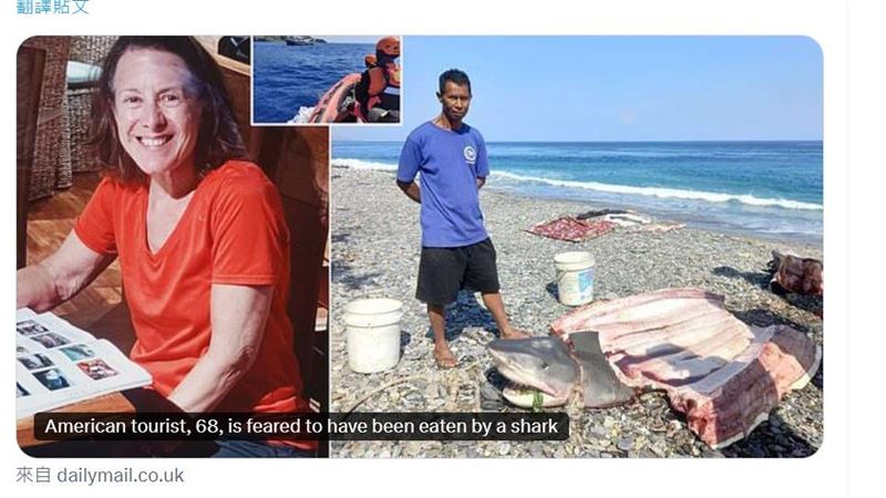 ▲68歲美國籍女子科琳(Colleen Monfore)去印尼潛水失蹤,殘肢在沙魚腹中被發現。(圖/翻攝自X@mmnjug)