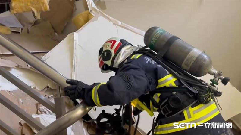 ▼▲第一時間不確定氣爆現場是否會發生火災,所以首批消防人員都背著空氣呼吸器全套裝備,總重量達2、30公斤,從1樓爬到11、12和13樓,逐層搜索救人。(圖/翻攝畫面)