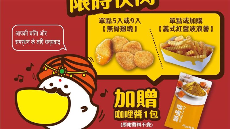事發後不少網友敲碗可以出印度餐點,丹丹漢堡除了橋頭店之外,各分店昨晚宣布,6月23日至7月10日推出「嘟嘟嚕嘟丹丹丹限時快閃」活動,單點5入/9入無骨雞塊或是單點/加購義式紅醬波浪薯,就加贈咖哩醬一包。