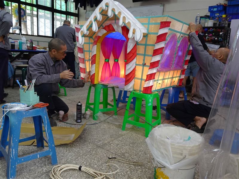 新竹監獄表示,奪冠作品《童話》的設計理念旨在喚起每個人心中塵封已久的童話樂園。作品主體是一座溫潤質樸的餅乾屋,覆蓋著層次分明的厚實奶油屋頂,上方點綴鮮紅欲滴的巨型草莓與繽紛彩虹糖,屋內駐足著一匹眼神溫柔、姿態生動的小馬,彷彿是這座夢幻樂園的主人,邀請觀者一同入內尋找初心。而在作品後方閃耀的摩天輪,則象徵著快樂不停轉動、希望永不落幕,引導觀展民眾走入這場由光影交織而成的甜蜜饗宴。
