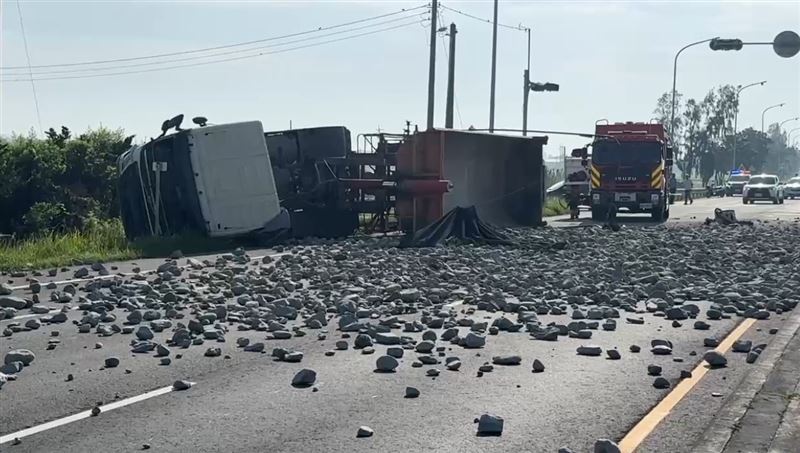 警方調查,今天上午7時許,載送土石的聯結車,疑未注意前方車況,為閃避機車時,不慎追撞前方的自小客車,自小客車因撞擊力衝入田間溝渠,聯結車翻覆路邊,其中聯結車駕駛、自小客駕駛與乘客等,共釀4人受傷送醫,車禍原因及經過還要再調查。